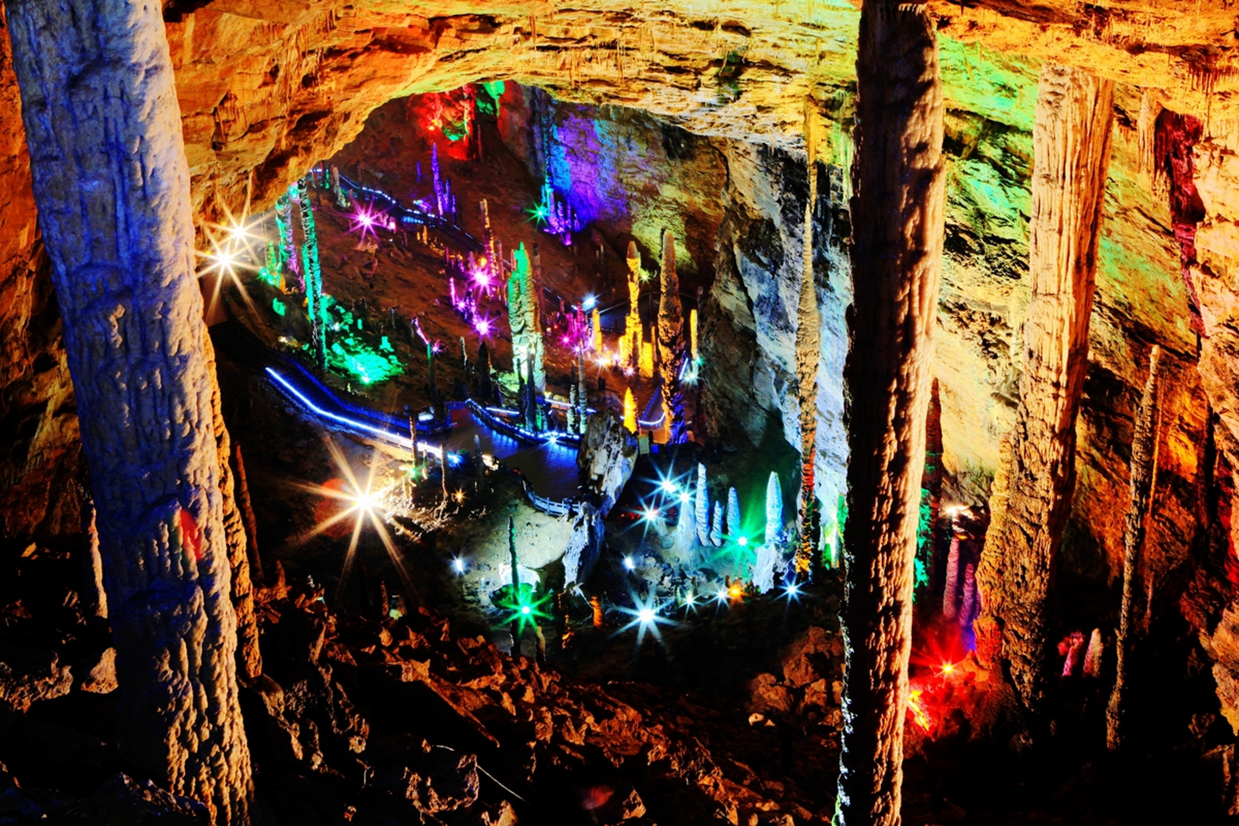 龍宮大廳是目前世界上旅游溶洞內容最為豐富的大廳。龍宮位于黃龍洞第四層,是黃龍洞最先形成和面積最大的廳堂,底面積為14000平方米,現(xiàn)存有大小石筍、石柱1705根,各種景觀似人似物,惟妙惟肖,千姿百態(tài),精彩紛呈。